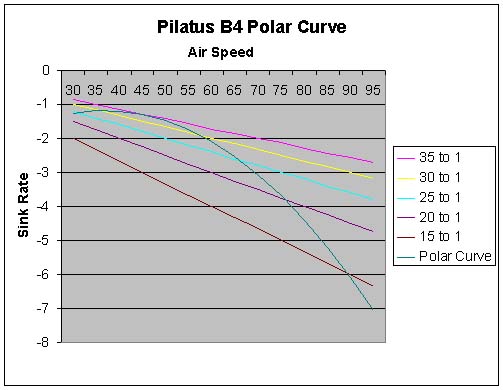 This graph represents the polar curve for the Pilatus B4 glider at max all up weight. Pilatus Aircraft Co never plotted a complete polar only min sink and best L/D, this curve is calculated by use of a quadratic formula sink rate = av^2 +bv + c. where v is the indicated air speed and a, b and c are constants. |